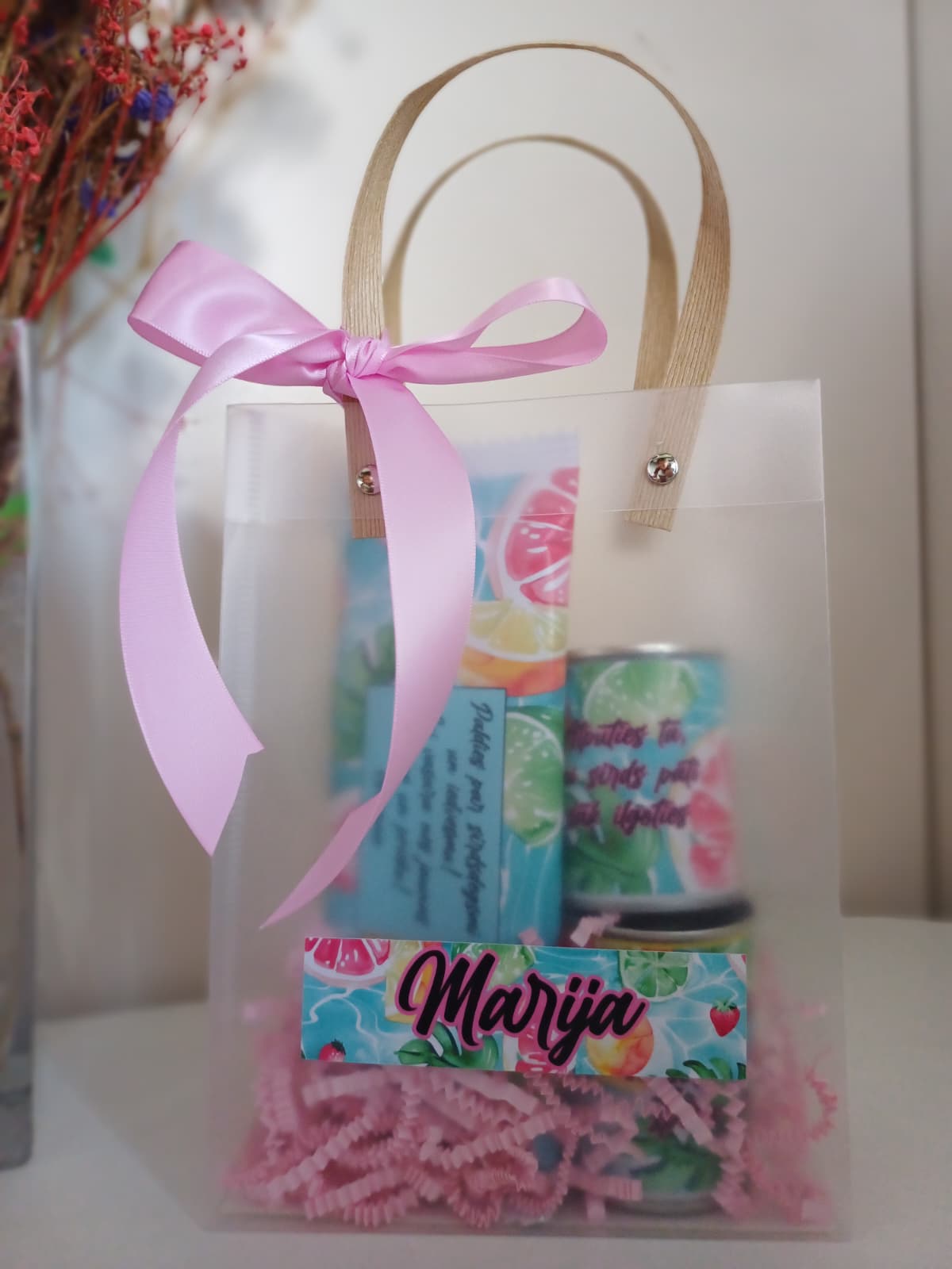 Dāvanu komplekts “Neliels pārsteigums” ar personalizētu noformējumu. Kompakts un gaumīgs dāvanu risinājums, kas apvieno saldu dāvanu un personalizāciju vienotā dizainā.