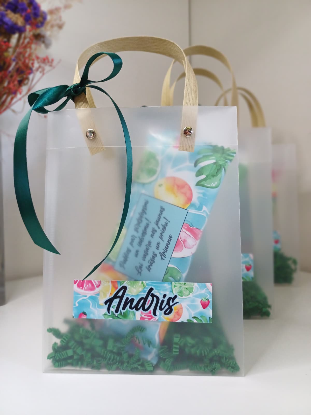 - dekoratīvs iepakojums (dāvanu soma ar rokturiem)