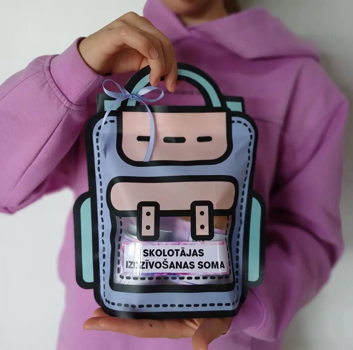 - Soma izgatavota kā stilīga, rotaļīga mugursomas forma