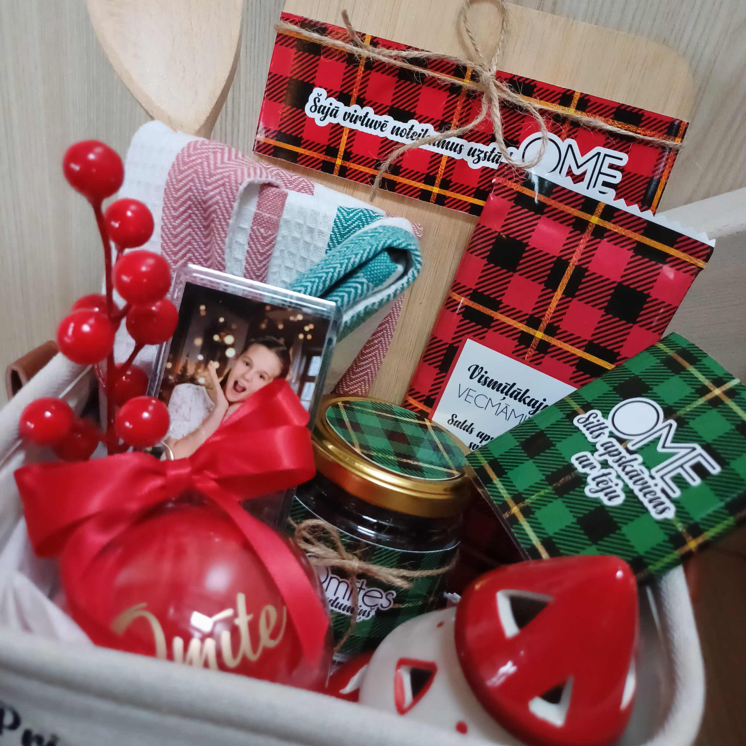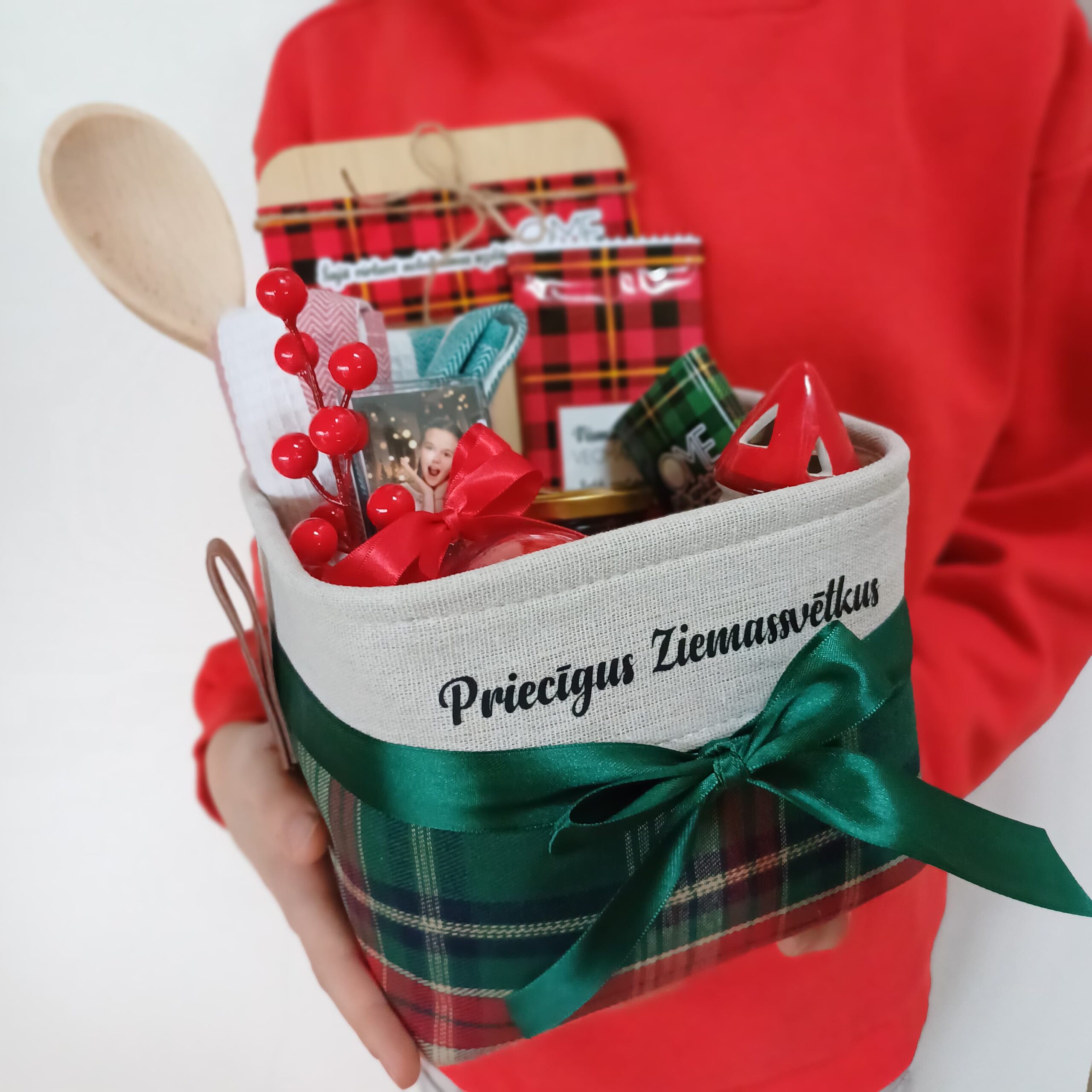 Katrs priekšmets ir rūpīgi izvēlēts, lai radītu svētku atmosfēru un padarītu dāvināšanas brīdi īpašu. Dāvana ir noformēta elegantā pleda stila grozā, kas lieliski noderēs kā interjera detaļa vai praktisks glabāšanas grozs.