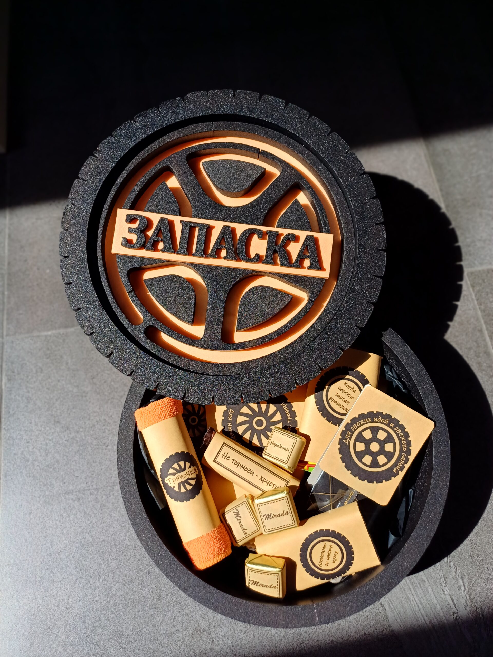Ja meklē dāvanu, kas būs gan oriģināla, gan praktiska, “Запаска / Rezerves Riepa” dāvanu kaste ir pārdomāts risinājums. Tā ir tematiska un personalizējama dāvana, veidota rezerves auto riteņa stilā, kas piešķir tai izteiktu auto nozares raksturu un vizuālu individualitāti. Kvalitatīvi izstrādāts dizains un saturs padara šo komplektu par piemērotu pārsteigumu ikvienam autobraucējam.