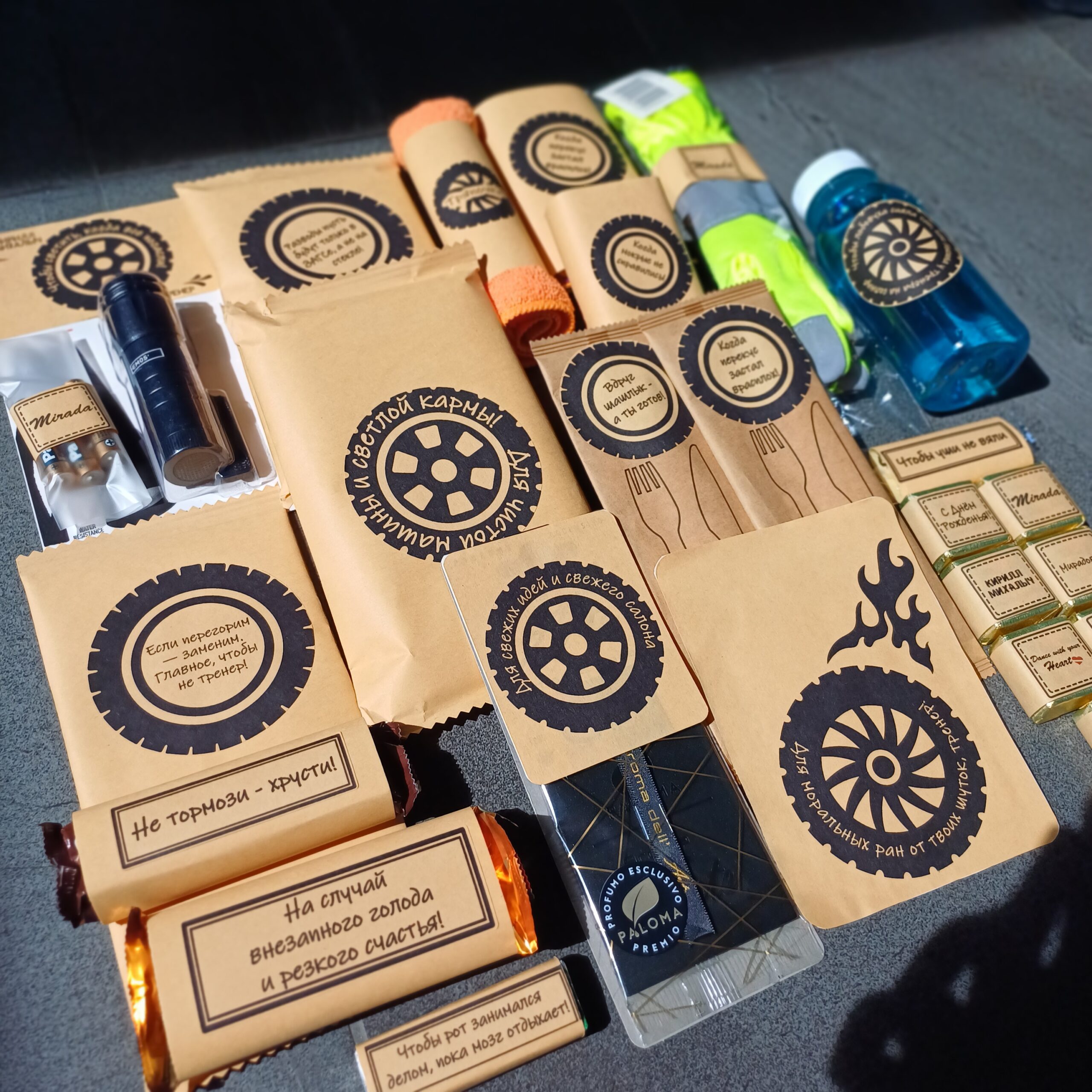 Dāvanu komplekts aprīkots ar praktiskiem auto un ikdienas lietošanas piederumiem, kuri papildināti ar tematiskiem, lakoniskiem tekstiem: